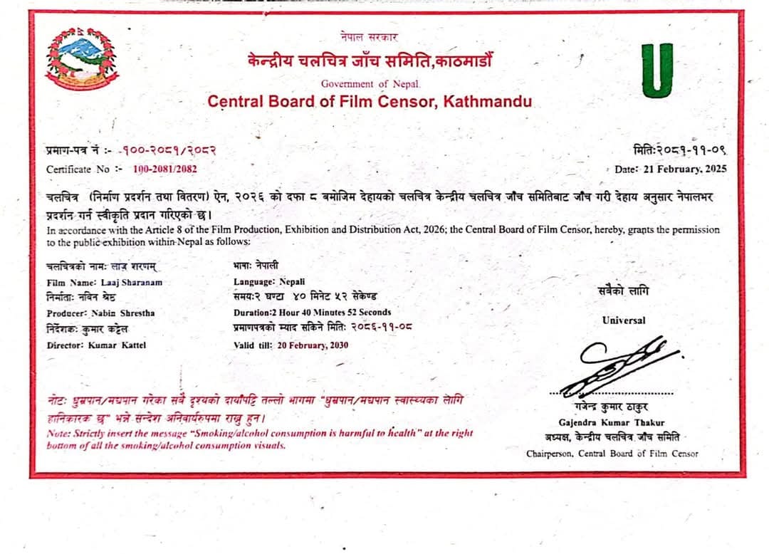 सोहीक्रममा केन्द्रीय चलचित्र जाँच समितिले फिल्म ‘लाज शरणम्’लाई बोर्ड अध्यक्ष गजेन्द्र ठाकुरले आइतबार बिहान फिल्मलाई ‘युनिभर्सल’ प्रमाणपत्र प्रदान गर्दै प्रदर्शन अनुमति दिएको छ ।