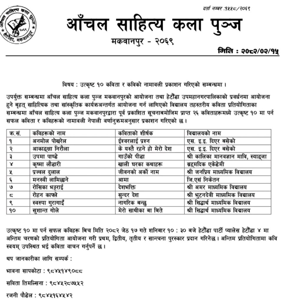 हेटौंडा । आँचल साहित्य कला पुञ्ज मकवानपुरको आयोजनामा भोलि शनिबार हुन लागेको माध्यमिकतह विद्यालयस्तरीय कविता प्रतियोगिताका लागि उत्कृष्ट १० कविको सूचि सार्वजानिक भएको छ । बिहीबार आँचल साहित्य कला पुञ्जकी अध्यक्ष भावना सापकोटाले वृहत साहित्यक तथा साँस्कृतिक कार्यक्रममा हुन लागेको कविता प्रतियोगितामा छनौट भएका उत्कृष्ट १० कविको सूचि सार्वजानिक गरेका हुन् ।