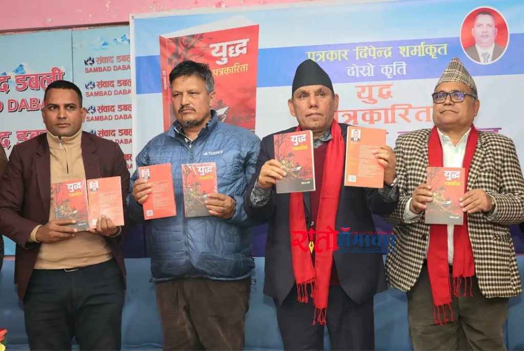 हेटौंडा । संघर्षका सात अध्याय बोकेको जाजरकोटका पत्रकार दीपेन्द्र शर्माको कृति युद्ध पत्रकारिता पुस्तकको काठमाडौंमा लोकार्पण” गरिएको छ । शुक्रबार काठमाडौंको आनामनगरस्थित संवाद डबलीमा एक समारोहकाबीच  पत्रकार दीपेन्द्र शर्माको ७ अध्याय बोकेको कृति युद्ध पत्रकारिता पुस्तकको लोकापर्ण गरिएको हो । यस अघि शर्माको पहिलो पुस्तक युद्ध, शान्ति र पत्रकारिताको जीवन्त अनुभूति ‘जुनिदेखि पिलिसम्म’ गत वर्ष सार्वजानिक भएको थियो । गत वर्षको भदौमा तत्कालिन प्रधानमन्त्री एवम नेपाली कम्युनिष्ट पार्टी (नेकपा)का केन्द्रीय अध्यक्ष पुष्पकमल दाहाल ‘प्रचण्ड’ले उक्त पुस्तकलाई लोकापर्ण गरेका थिए । पत्रकार शर्मा प्रेस सेन्टर नेपालका पूर्व उपमहासचिव एवम् नेपाल पत्रकार महासंघका पूर्व केन्द्रीय सदस्य हुन् ।