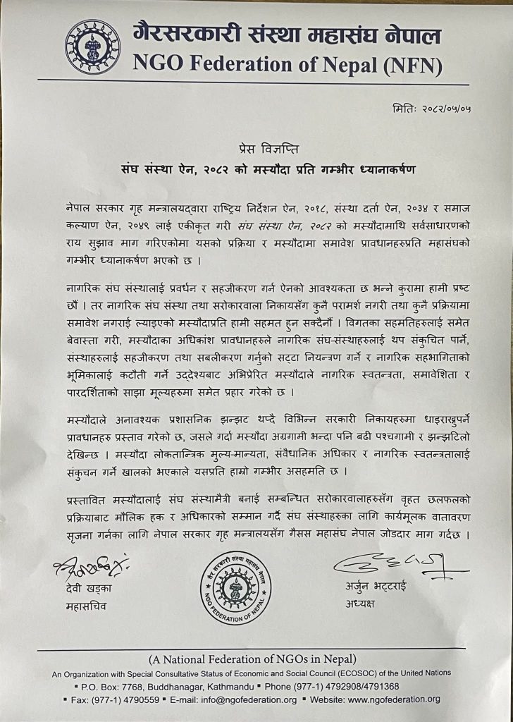 ‘नेपाल सरकार गृह मन्त्रालयद्वारा राष्ट्रिय निर्देशन ऐन २०१८, संस्था दर्ता ऐन २०३४ र समाज कल्याण ऐन २०४९ लाई एकीकृत गरी संघ संस्था ऐन २०८२ को मस्यौदामाथि सर्वसाधारणको राय सुझाव माग गरिएकोमा यसको प्रक्रिया र मस्यौदामा समावेश प्रावधानहरुप्रति महासंघको गम्भीर ध्यानाकर्षण भएको छ,’ महासंघद्वारा जारी विज्ञप्तीमा उल्लेख छ ।