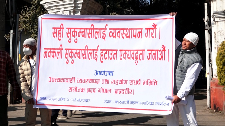 उपत्यकावासी व्यवस्थापन तथा सहयोग सङ्घर्ष समितिले सुन्धारामा रहेको महानगरको कार्यालय अगाडि प्रदर्शन गर्दै सक्कली सुकुम्वासीको व्यवस्थापन गर्न र नक्कली सुकुम्वासीलाई तत्कालै नदी किनारबाट हटाउन माग गरेको हो । सुकुम्वासीको घर टहरा हटाइ, काठमाण्डौको सुन्दरता, सुशान्ति र मैत्रीपूर्ण वातावरण सिर्जना गर्न एक इन्च पनि महानगर पछि हट्न नहुने उनीहरूको भनाइ छ ।