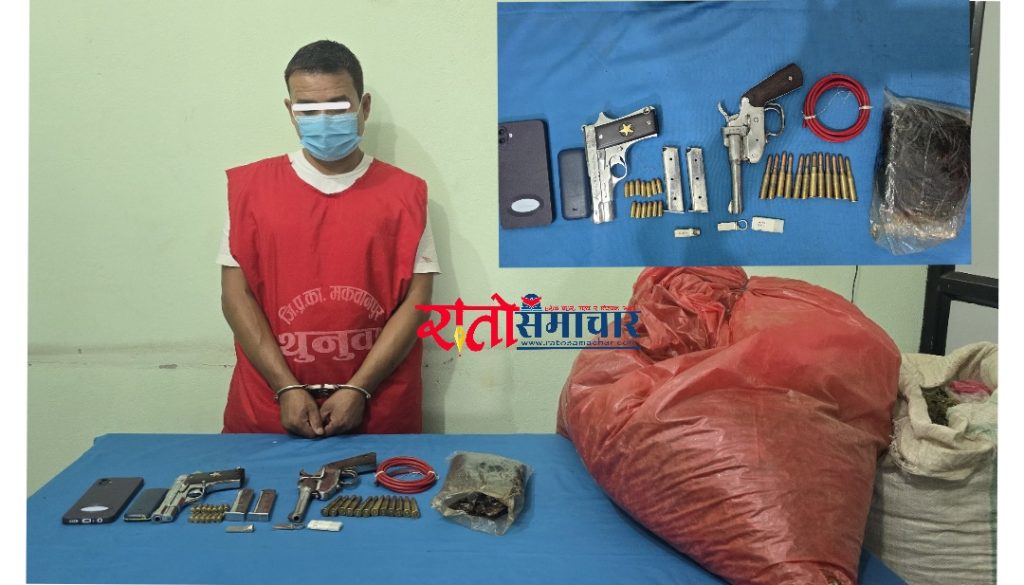 हेटौंडा । २ थना पेस्तोल, लागूऔषध अफिम र गाँजासहित राक्सिराङ्ग गाउँपालिका वडा नम्बर–१ का राजु स्याङ्तान पक्राउ परेका छन् । आज बिहान पत्रकार सम्मेलनको आयोजना गर्दै बागमती प्रदेश प्रहरी कार्यालय हेटौंडा र जिल्ला प्रहरी कार्यालय मकवानपुरबाट संयुक्त रुपमा खटिएको प्रहरी टोलीले १÷१ थान एमएम युनिभर्सल मेड एन इटाली लेखिएको म्याग्जिन सहितको पेस्तोल र कटुवा पेस्तोल फेला सहित राक्सिराङ्गका राजु स्याङ्तानलाई पक्राउ गरेका छन् ।