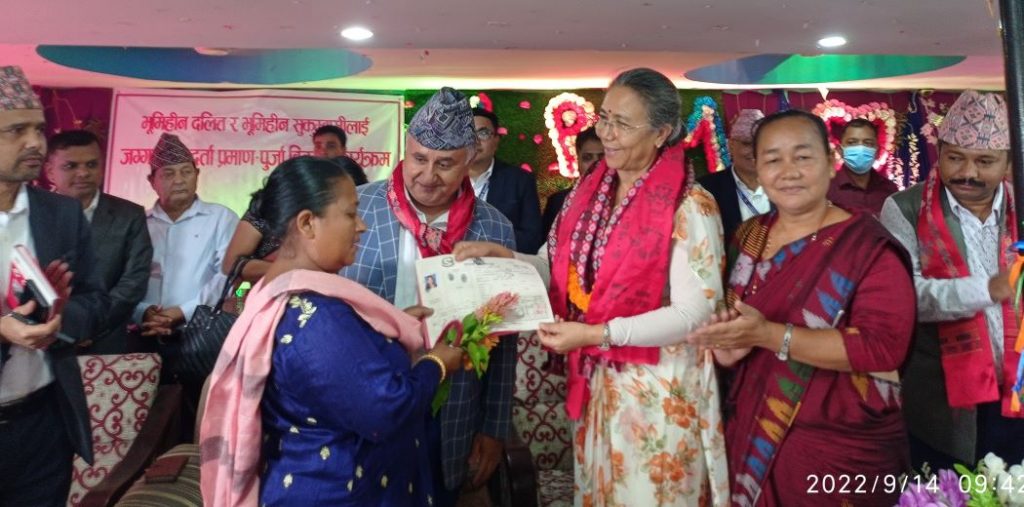 मन्त्री श्रेष्ठले कानेपोखरी –६ स्थित रमाइलो जन एकता साकोसको सभाहलमा राष्ट्रिय भूमि आयोग मोरङ जिल्ला समितिले आयोजना गरेको कार्यक्रममा सो प्रमाणपुर्जा वितरण गर्नुभयो । कानेपोखरी ६ का १८ परिवार भूमिहीन दलित र ४४ परिवार भूमिहीन सुकुम्वासीलाई धनीपुर्जा प्रमाणपत्र वितरण गरिएको हो ।