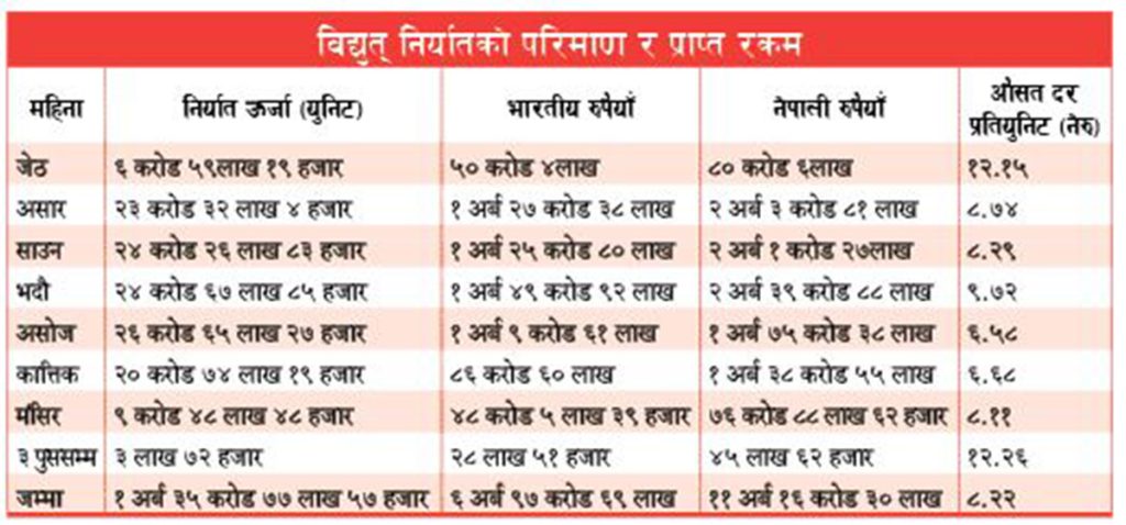 प्राधिकरणले गत आर्थिक वर्षको जेठ र असार महिनासहितको सात महिनाको अवधिमा भने ११ अर्ब १६ करोड ३० लाख रूपैयाँको विद्युत् भारततर्फ निर्यात गरेको जनाएको छ। प्राधिकरणले सो अवधिमा एक अर्ब ३५ करोड ७७ लाख ५७ हजार युनिट विद्युत् निर्यात गरेको छ। प्राधिकरणले देशभित्र खपत गरी उभ्रिएको (वर्षा यामको) विद्युत् २०७९ जेठ १९ गतेबाट इन्डियन इनर्जी एक्सचेन्ज लिमिटेड (आइएक्स)को डे-अहेड बजारमा प्रतिस्पर्धा मार्फत बिक्री सुरु गरेको थियो।