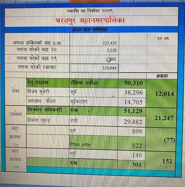 भरतपुर महानगरपालिकामा १ लाख २७ हजार ८३९ मत खसेको थियो । मतगणनाको नतिजा अनुसार गणना बाँकी रहेको मत भन्दा पनि दाहाल र अधिकारीकै अधिक मत हुने भएका आधारमा गठबन्ध तर्फका २ उम्मेदवार विजयी भएका हुन् ।