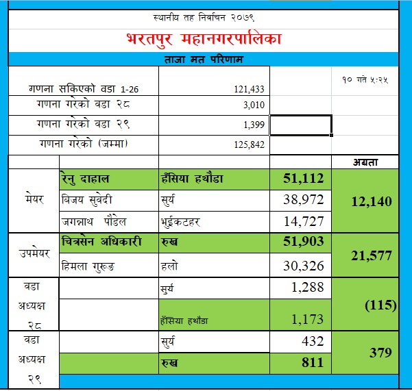 भरतपुर महानगरपालिकामा १ लाख २७ हजार ८सय ३९ मत खसेको थियो । मतगणनाको नतिजा अनुसार गणना बाँकी रहेको मत भन्दा पनि दाहाल र अधिकारीकै अधिक मत हुने भएका आधारमा विजयी भएका हुन् ।