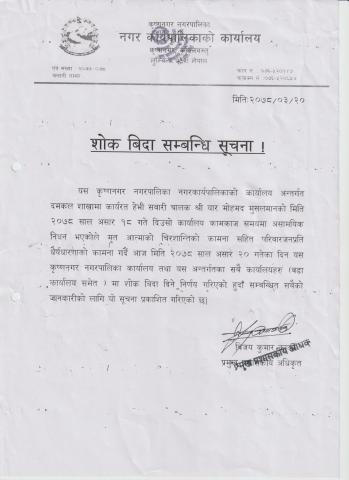 नेपाली कांग्रेसका नेता एवं प्रतिनिधिसभा सदस्य प्रदीप गिरीको निधनमा सिरहाको कल्याणपुर नगरपालिकाले आज शोक बिदा दिएको छ । कल्याणपुर नगरपालिकाका प्रमुख प्रशासकीय अधिकृत विष्णु रन्जन बरालद्वारा जारी सूचनामा नेता गिरीको निधनमा नगरपालिकाले शोक बिदा दिएको उल्लेख छ ।