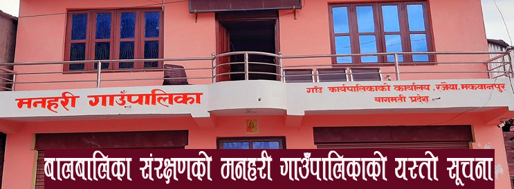 मकवानपुरको मनहरी गाँउपालिकाले बाबु आमा विहिन बालबालिका संरक्षणको लागि मनहरी गाउँपालिकाले सूचना जारी गरेको छ ।
