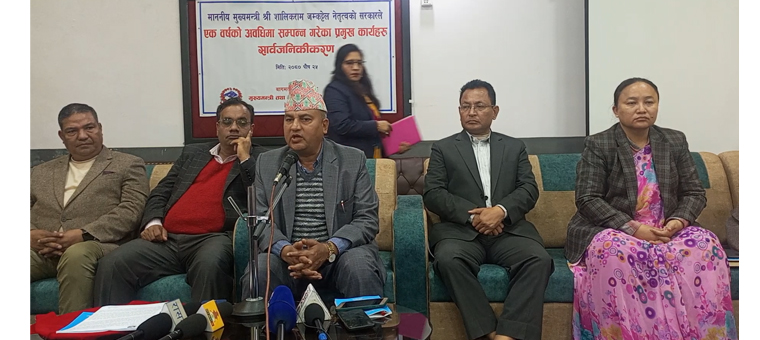 बागमती प्रदेश सरकार मुख्यमन्त्री जम्कट्टेल नेतृत्वको को एक वर्ष पूरा भएसंगै बुधबार मुख्यमन्त्री जम्कट्टेलले पत्रकार सम्मेलन मार्फत प्रदेश सरकारले गरेका कामको बारेमा जानकारी गराउदै यस्तो बताएका हुन् ।