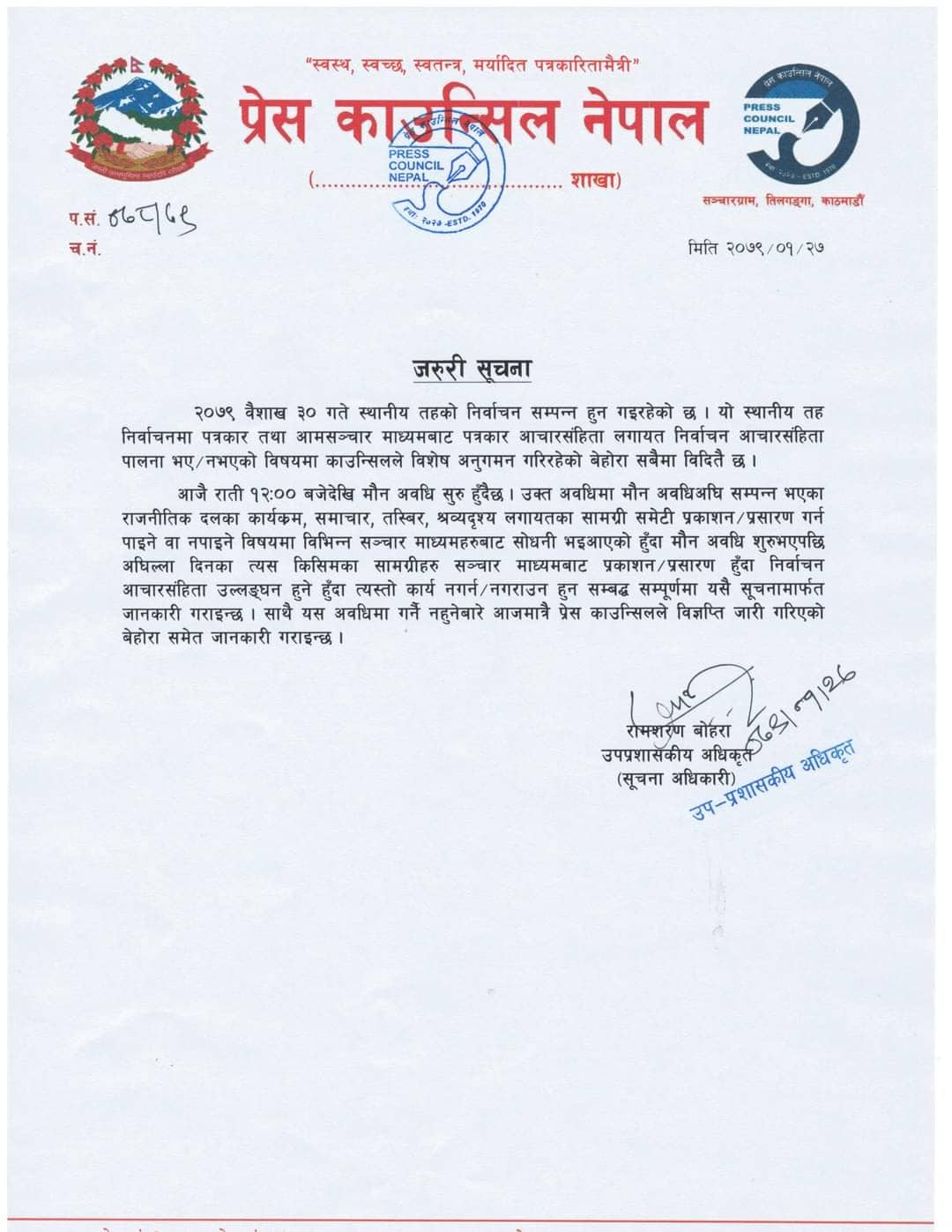 मंगलबार राती मध्यान्न १२ बजेबाट सुरुहुने मा्रन अवधीमा पत्रकाररुलाई गम्भिर हुन प्रेस काउन्सिल नेपालले आग्रह गरेको छ ।