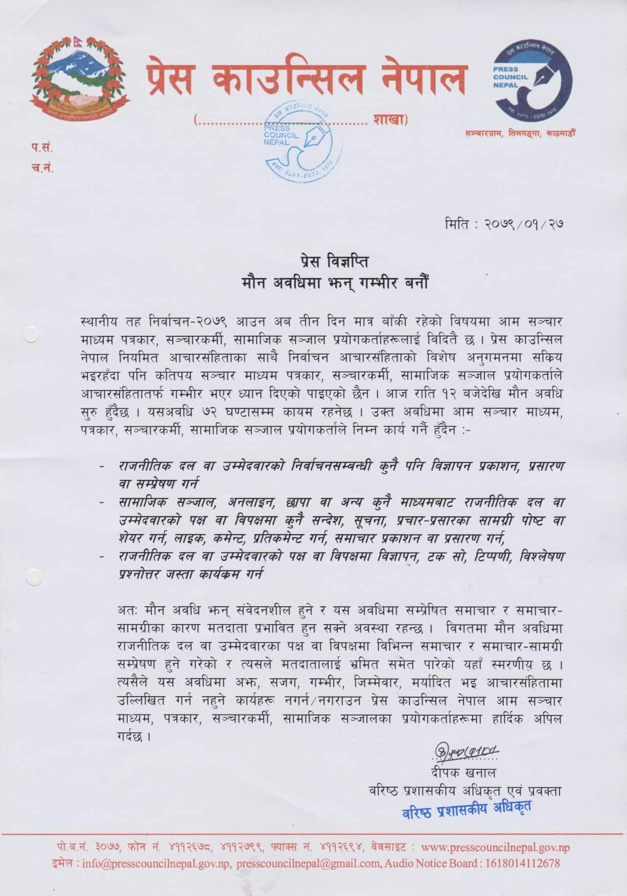 शुक्रवार हुन गइरहेको निर्वाचनका लागि मंगलबार राति १२ बजेदेखि सुरु हुने मौन अवधीमा गर्नुपर्ने कार्यका लागि विज्ञप्ती जारी गरिरहेको छ ।
